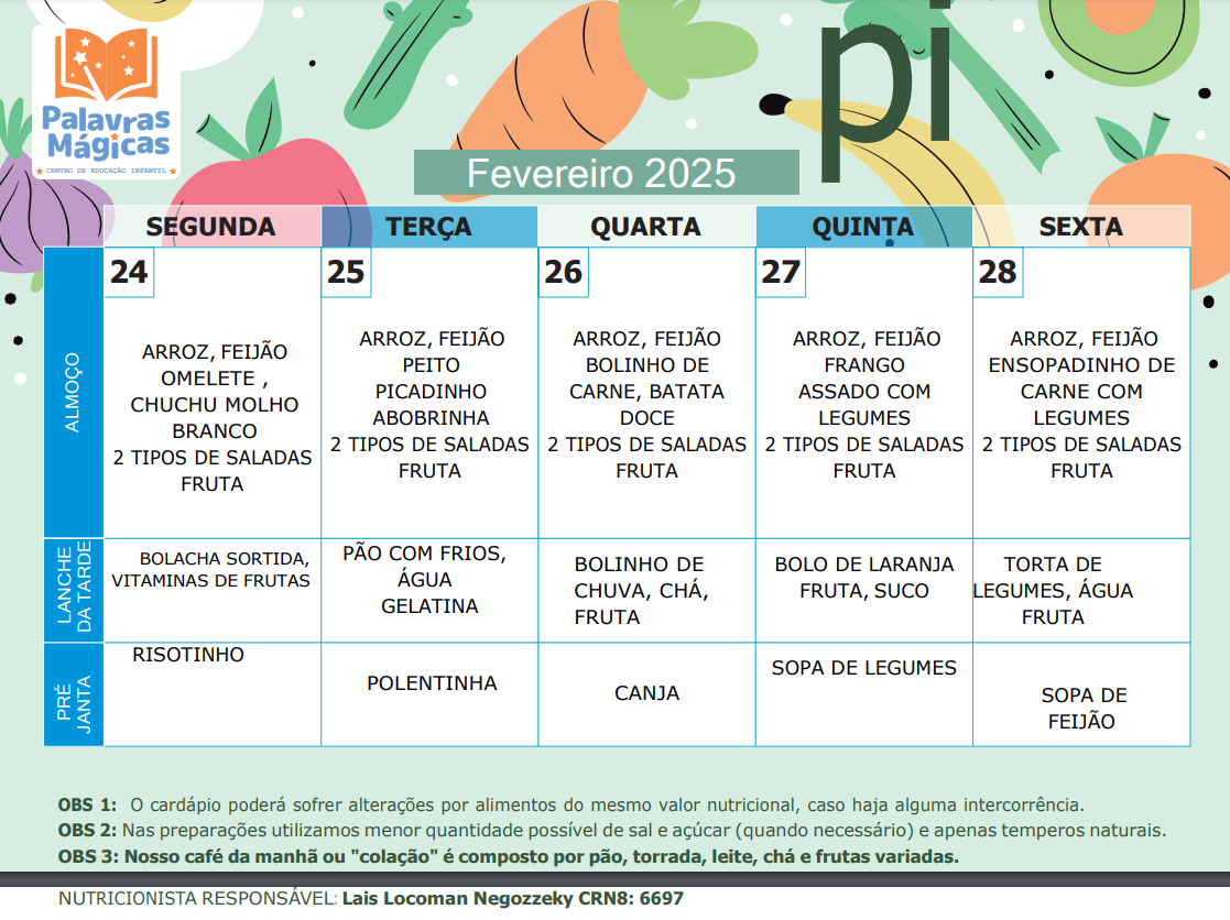 Cardápio 24 – 28 de Fevereiro